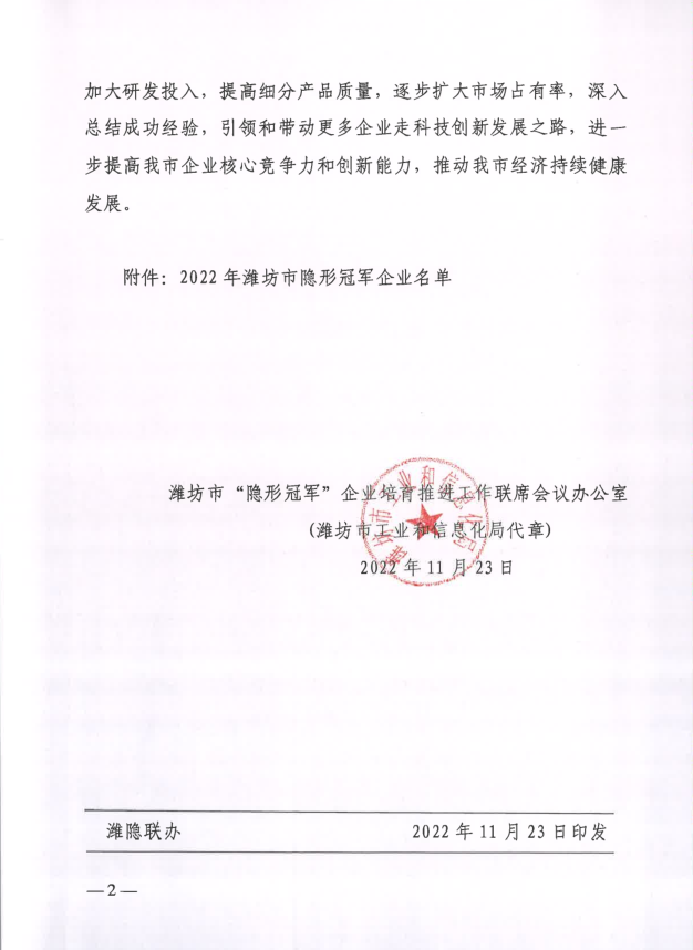 沃华科技荣膺2022年度潍坊市隐形冠军企业