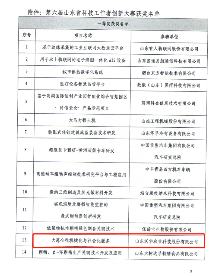 喜报!沃华大葱全程机械化与社会化服务项目获省科技工作创新大赛一等奖